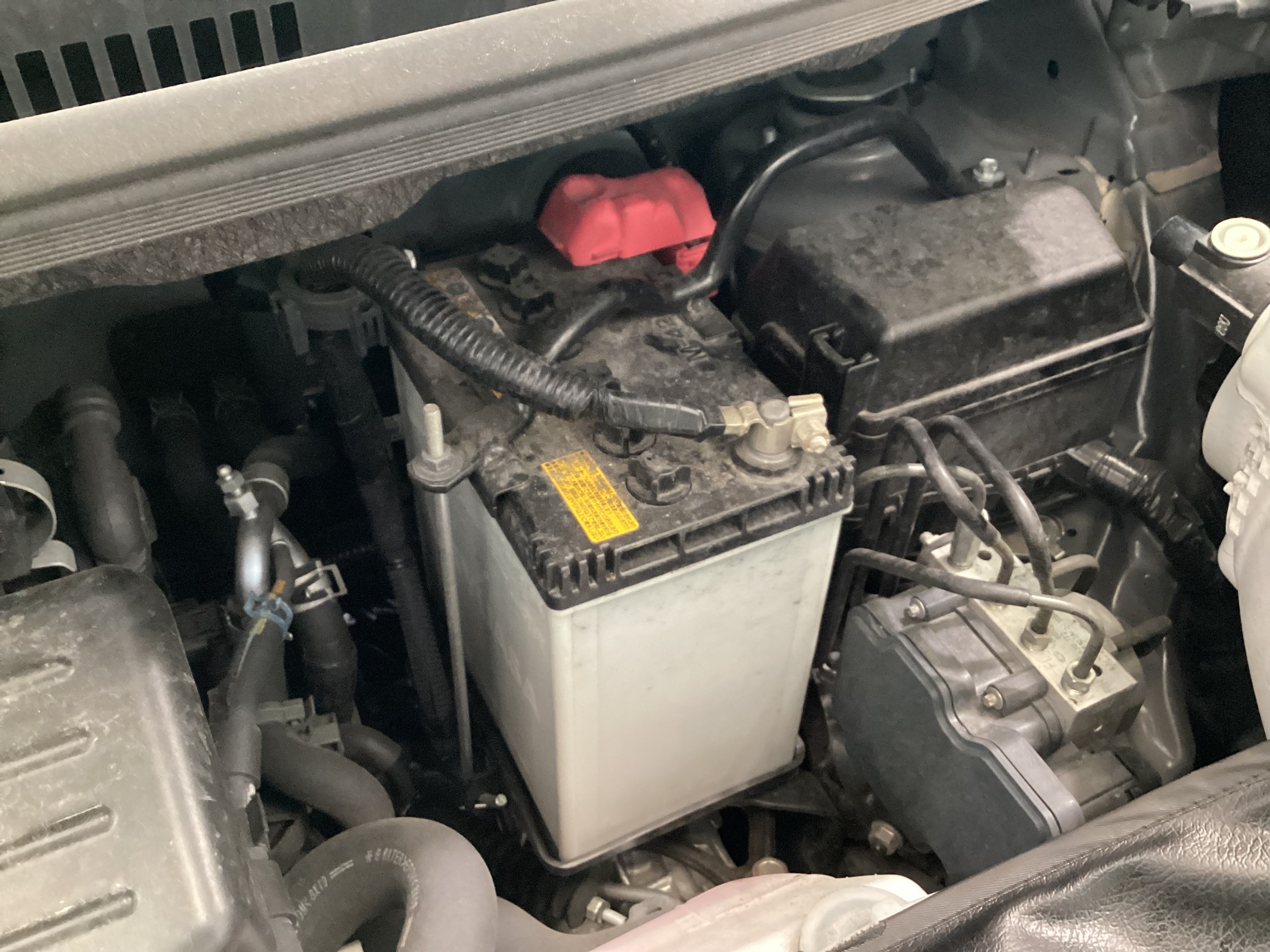 まず、ボンネットを開けると写真のようにバッテリーがついています。