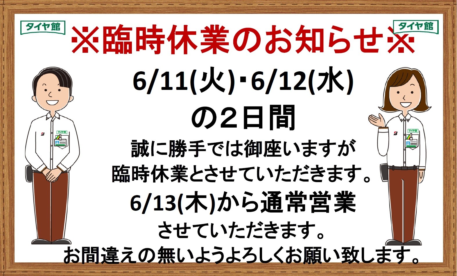 < 臨時休業のお知らせ > ポスト 2024年6月11日 いつもタイヤ館松原のホームページをご覧いただきありがとうございます! 6月11日(火)~12日(水) 臨時休業とさせていただきます。 6月13日(木) 10:30より通常営業いたします。 タイヤ・カーメンテナンスのことならタイヤ館 松原へぜひお立ち寄りください! パンクなどの緊急時もご相談ください。 ご不便をおかけいたしますが、何卒宜しくお願いいたします。 タイヤ館 松原 住所:580-0014大阪府松原市岡6-1-17 電話番号: 072-333-5580 相談予約 タイヤ点検・安全点検/タイヤ履き替え/オイル交換/その他ピット作業の予約