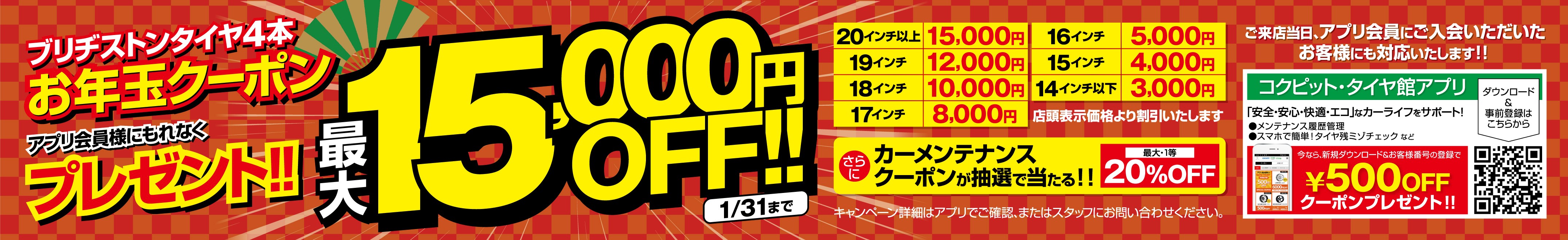 タイヤが最大15,000円引きが出来る、新春セールを開催中!!