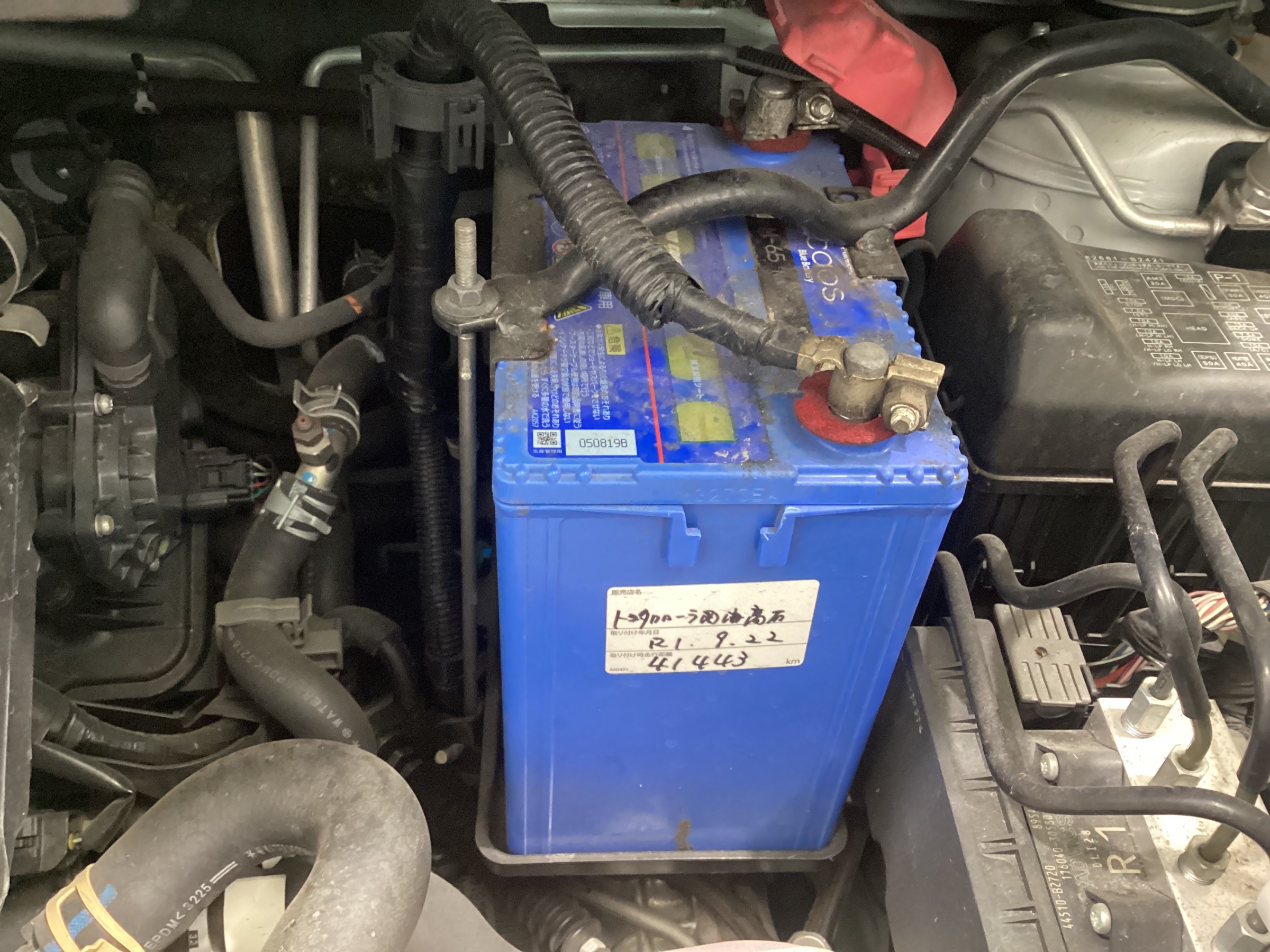 ボンネットを開けると写真のようにバッテリーがついています。