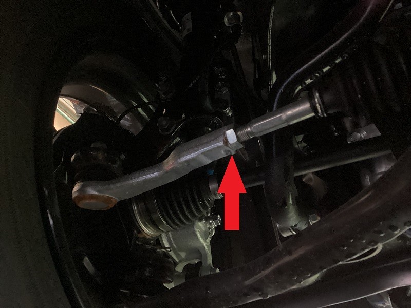 フロントはタイロッドエンドでの調整(矢印の場所)