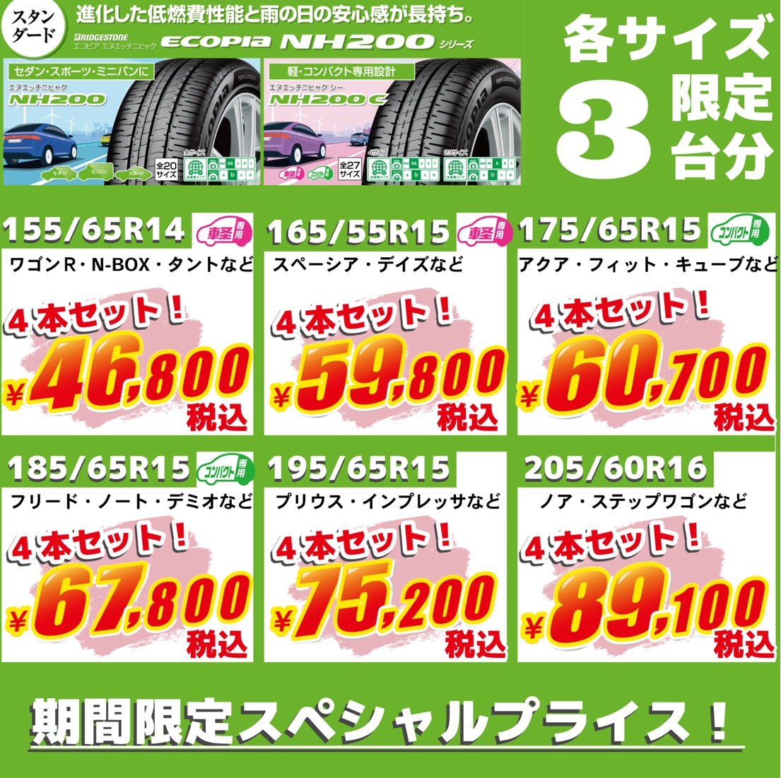 ※上記価格に別途タイヤ交換工賃、廃タイヤ処理料が必要です。