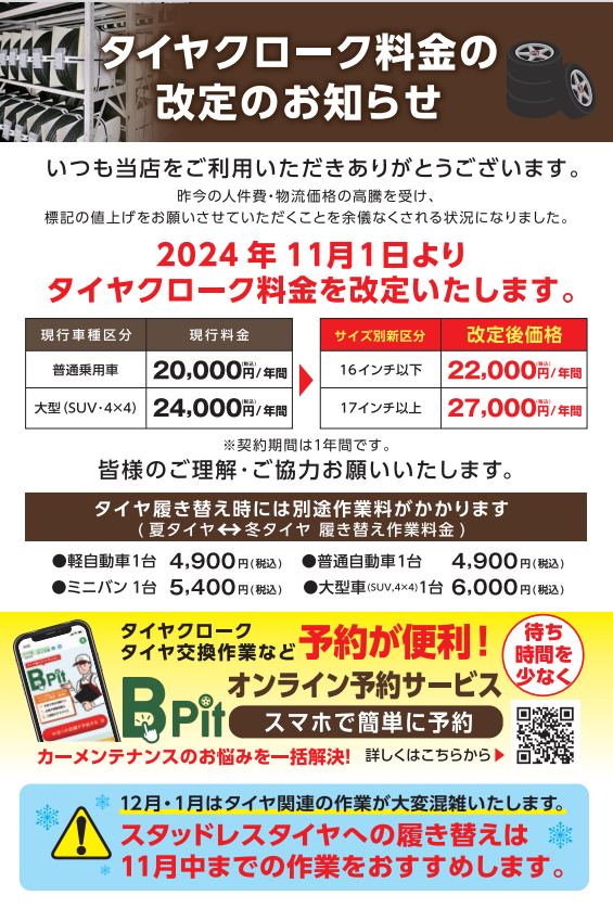 タイヤお預かりサービス(クローク契約)をご利用頂いているお客様へ
