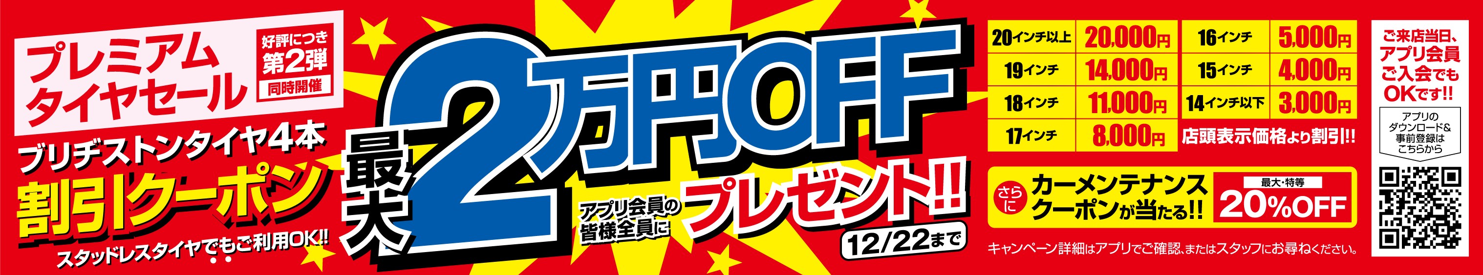 ★今年最後のセール★『2024年最後の決算セール』開催!! ポスト 2024年12月6日 ハンズマン松原店、近くのタイヤ館 松原です!! ホームページをご覧いただきありがとうございます! 『2024年最後の決算セール』 期間中はお買得商品多数ご用意!! 冬のお出かけ前に お買い得にタイヤを交換しませんか!? タイヤ買うなら今がチャンスですよ!! セール期間 12/1(日)~12/30(月)迄 是非、愛車のメンテナンスに当店をご利用ください。 好評いただいている最大20000円クーポンで ブリヂストンタイヤをお買い得に購入できるチャンス! タイヤ4本ご交換のお客様で、タイヤ館アプリをお持ちの方、 又は新規ダウンロードして頂いたお客様、20インチ以上の方は最大20000円割引クーポン発行されます! もちろんその他のタイヤサイズのお客様もお値引きクーポンが当たります!! (但し、ブリヂストンブランドのタイヤに限ります) 電話でのご相談も随時受け付けております、お気軽にご相談ください。 よろしくお願いいたします。 タイヤ館 松原 住所:580-0014大阪府松原市岡6-1-17 電話番号: 072-333-5580 相談予約 タイヤ点検・安全点検/タイヤ履き替え/オイル交換/その他ピット作業の予約