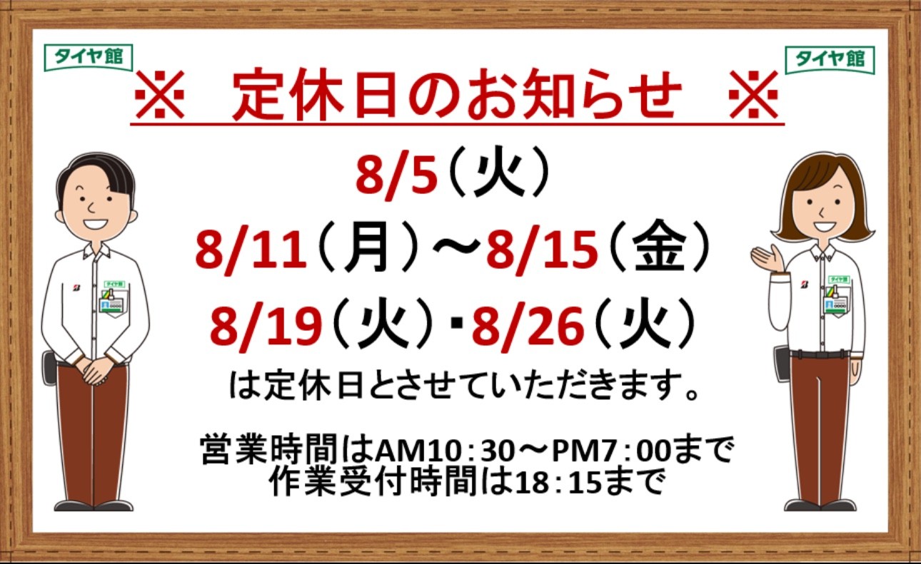 8月26日㈫は定休日です。お店が休みでもネットでもタイヤ購入や作業予約を取っていただけます♪