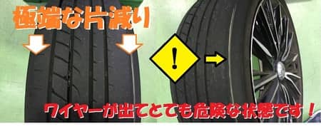 アライメント測定は今まで一度もされた事が無いという事・タイヤの磨耗の仕方・