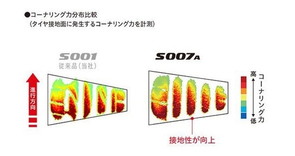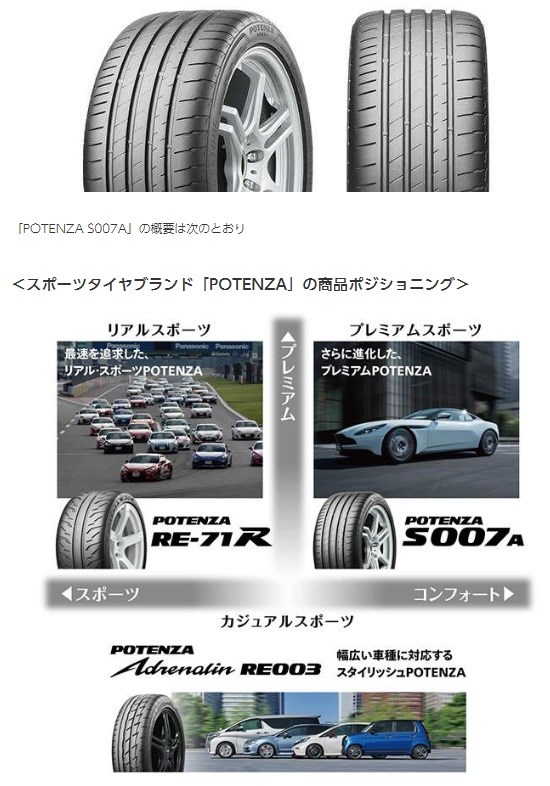 「POTENZA S007A」は、運動性能を重視する数々のハイパフォーマンスカーに新車装着タイヤとして採用され市販用タイヤとしてもグローバル展開している「POTENZA S001」の後継商品です。「POTENZA」の特徴であるドライ性能を更に向上させるとともに、ウェット性能とコンフォート性能にも配慮したタイヤです。また、当社のグローバル商品として日本のみならず北米・アジア各国でも順次販売します。