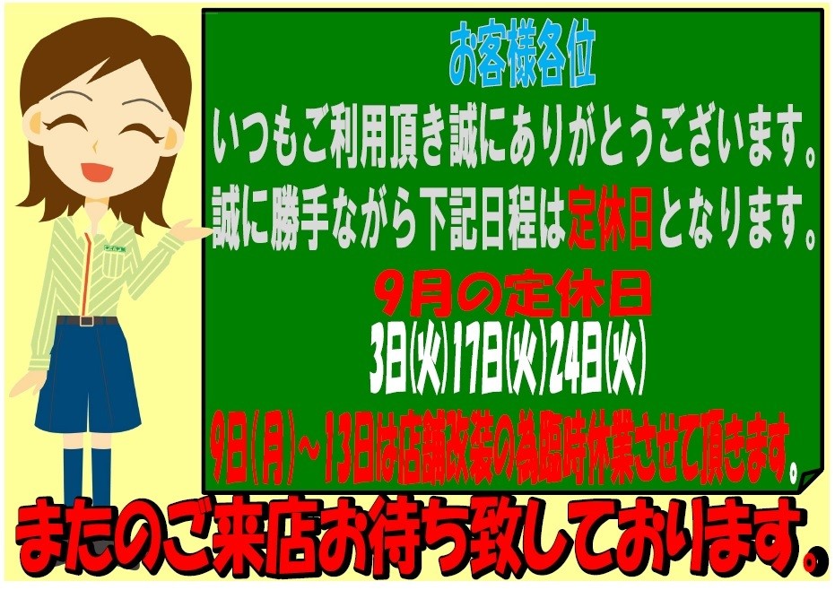 9月の定休日ですが、店舗改装に伴い通常の火曜日に加えて【9/9~9/13】までを