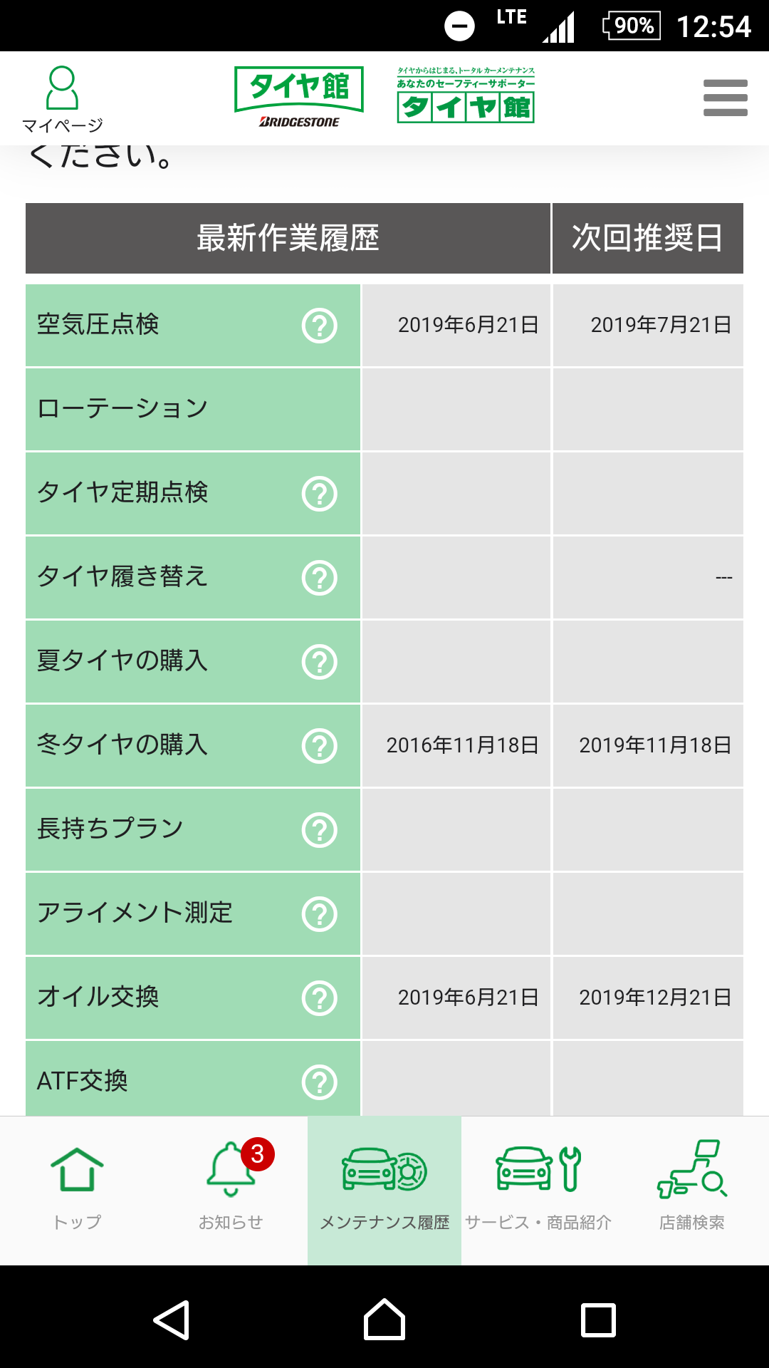 タイヤ館アプリのメンテナンス履歴の画面です!分かり良い!