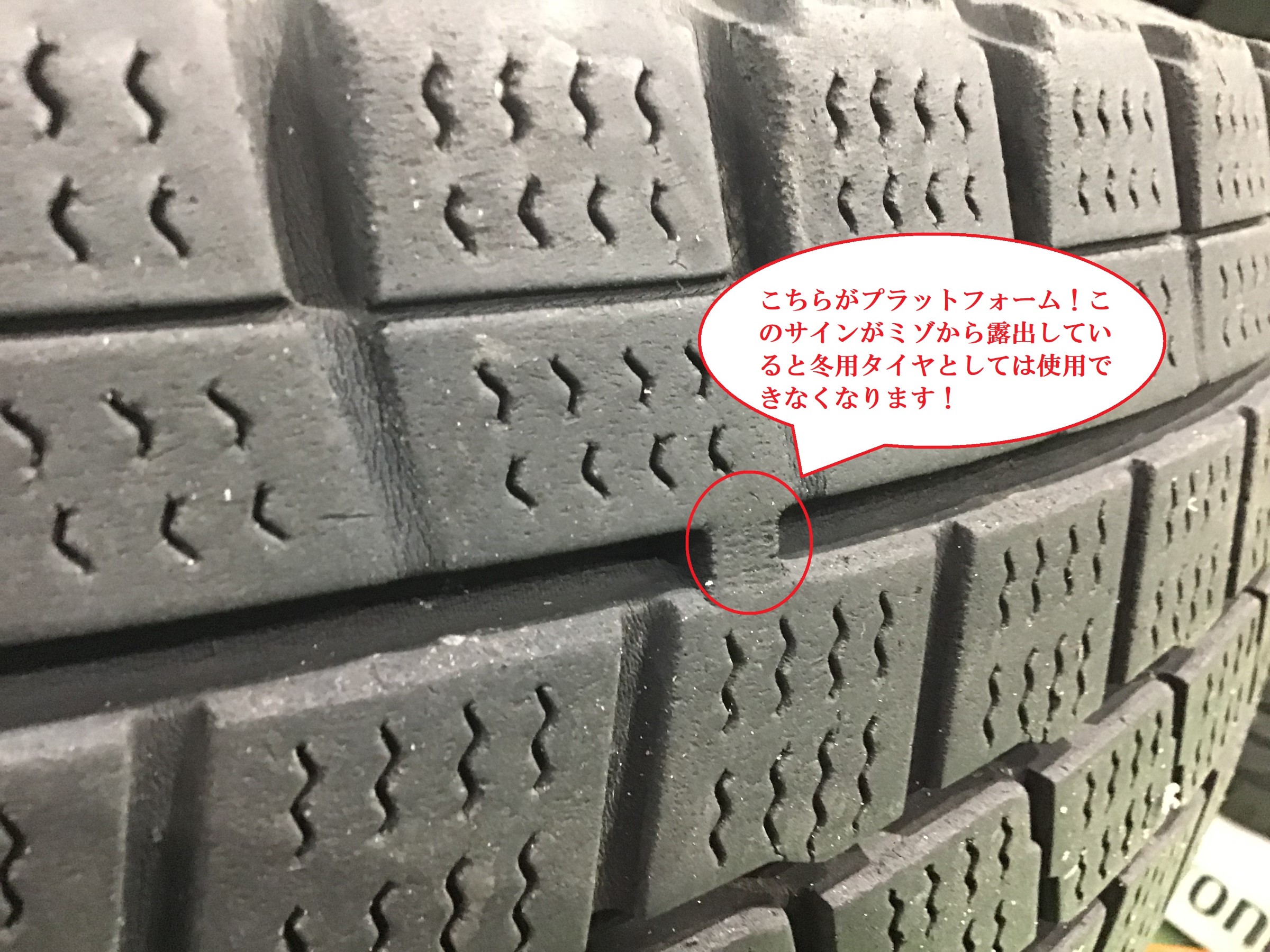 プラットフォームがもしミゾより露出しているとそれはミゾの深さが新品時より50%以上摩耗している事を表しており、即ち冬用タイヤとしては使用頂けないという事が確認できます(*_*)