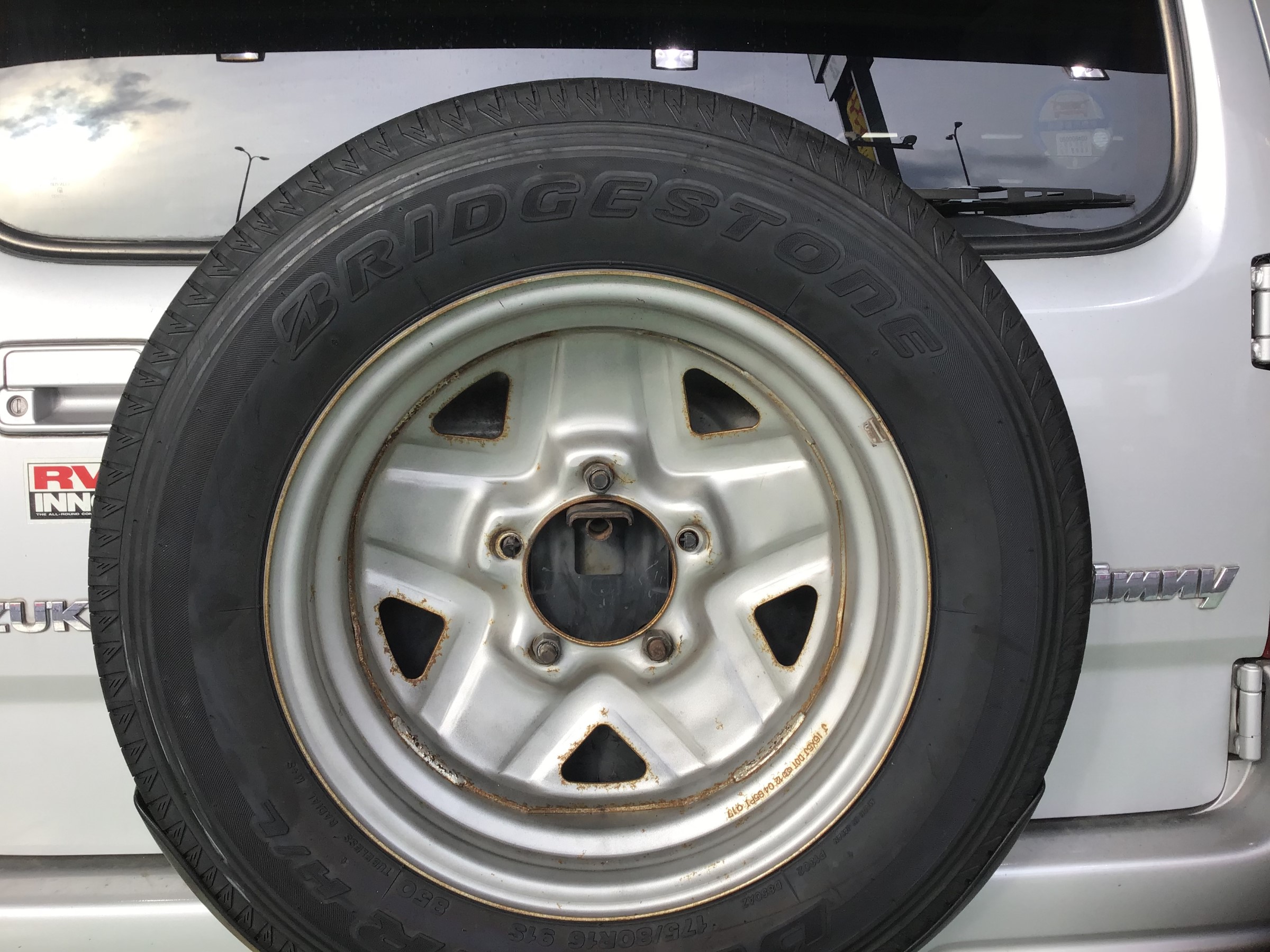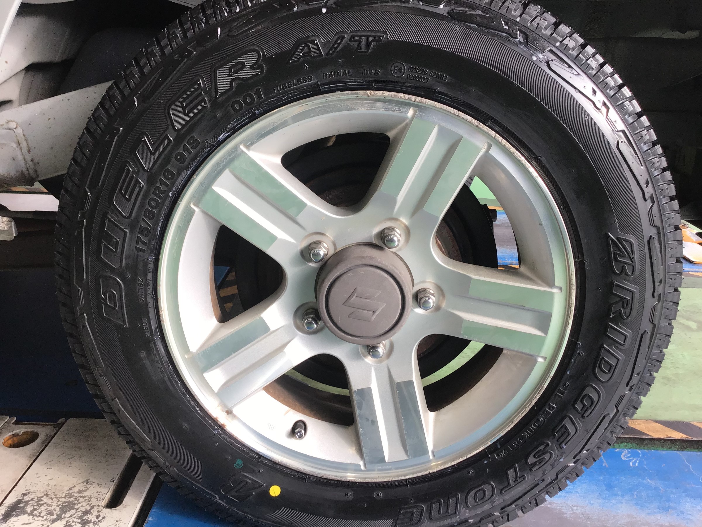 スペアタイヤに関してもお車が新車の時に装着されていたもので、もうバキバキにヒビ割れており、ゴムバルブも亀裂が入っていたので交換頂きました!計5本交換です!スペアタイヤはデューラーH/L850を使用!悪路を走る事がなく、運転時の静粛性にこだわる方向けのタイヤです!かっこよくブリヂストンマークが上に来るように上手に装着しました!