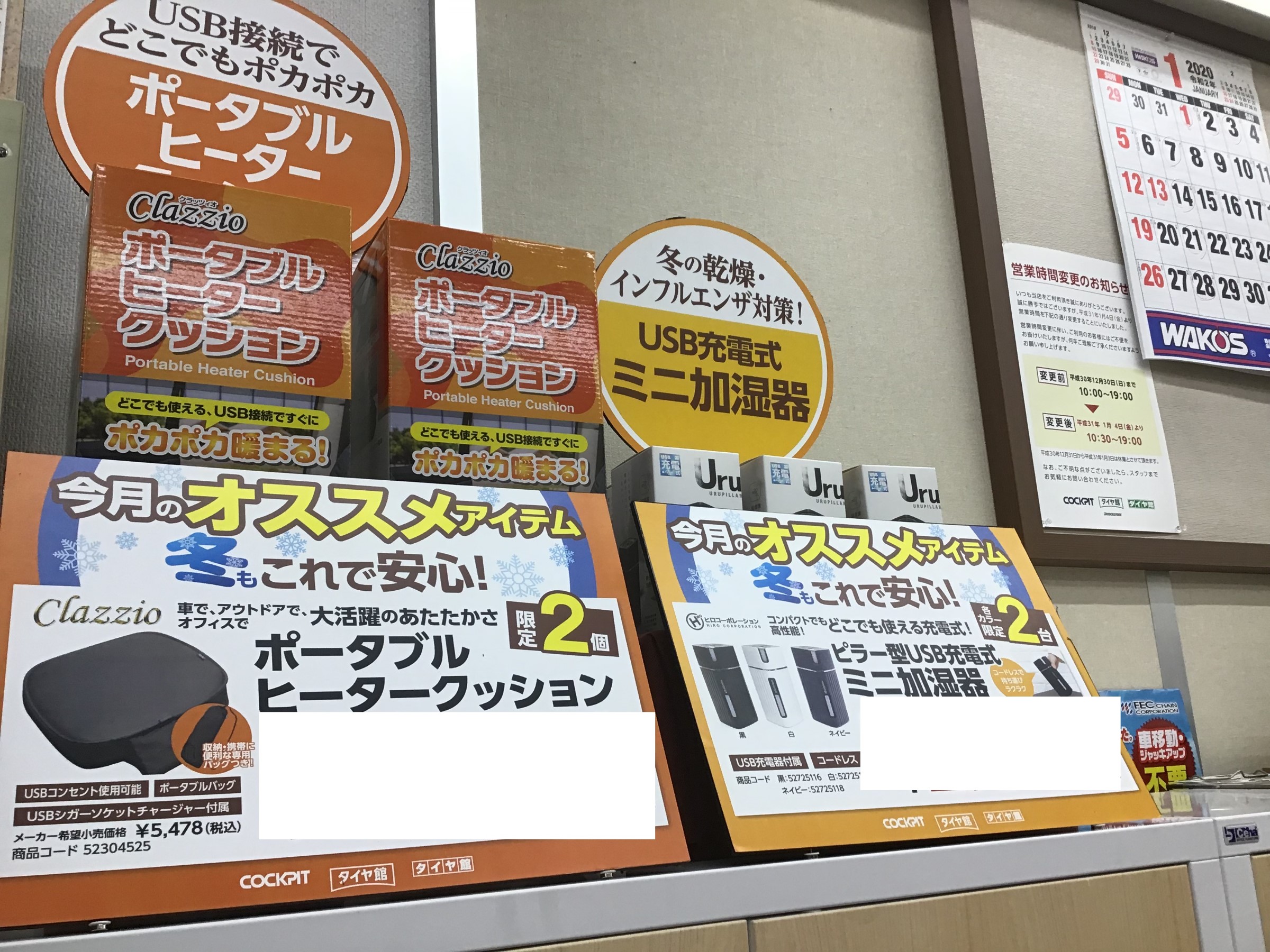 2つ目は車内・オフィス・キャンプ等で使えるポータブルヒータークッションです!こちらもUSBで充電が可能でシチュエーション選ばずに温か快適(^^♪「クラッツィオ」シートカバーでおなじみ、ここ松原に本社を置かれているイレブンインターナショナルの商品です!