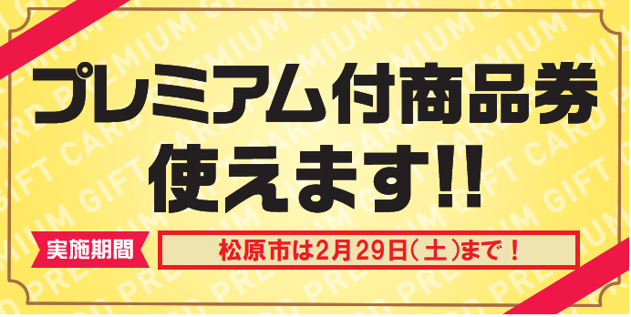 皆様!プレミアム付商品券についてはご存知かと思います!消費税増税に合わせて市町村から発行されたお得な商品券ですね~(*^_^*)こちら各市町村によりご使用頂ける期限が定められておりますが、ここ松原市は今月末2月29日(土)までとなっております!