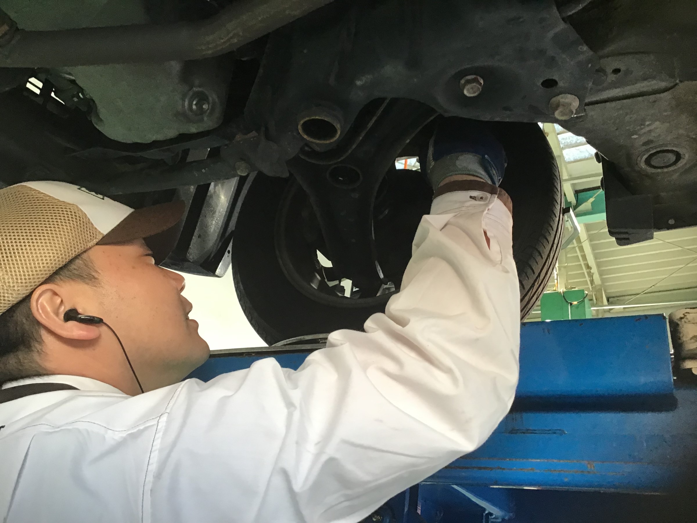 この部品を整備工場で交換頂きました!ただし、そのままでは問題が…。交換の際にドライブシャフト周辺の部品を引き抜いて交換するのでタイヤの取り付け角度がバラバラになってしまうのです(*_*)このままではハンドルが非常に取られる、タイヤの摩耗が早くなる、内・外どちらかが早く減ってしまう偏摩耗が起こる可能性があります。