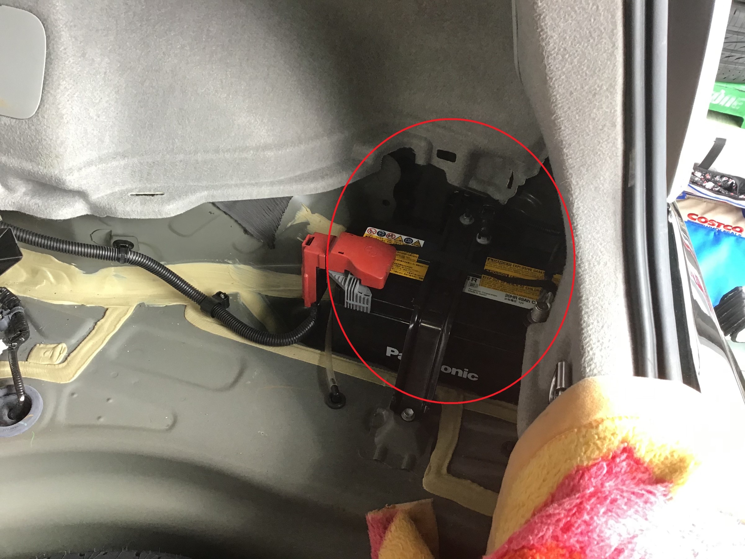 通常のガソリン車の場合バッテリーはボンネット内にある事が大半ですが、ブリウスはトランクの床下にバッテリーが鎮座しております( ..)φメモメモ