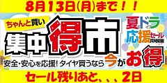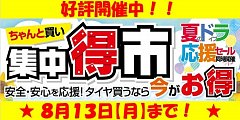 いつもタイヤ館 松原のホームページをご覧いただきありがとうございます! 本日をもちまして、 【 夏のドライブ応援セール & 集中得市セール 】が終了いたしました。 セール期間中にご来店いただいたお客様には、 厚く御礼申し上げます。 今後とも、 タイヤ館 松原をよろしくお願いいたします。 な...
