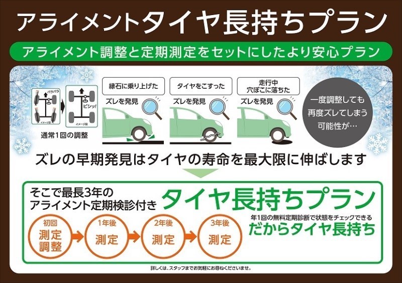 - タイヤ館 松原ではローテーションやアライメント測定・調整も承っています。タイヤは同じ位置で使い続けると摩耗が偏るため、5,000km走行ごとのローテーションをおすすめしています。アライメント調整には専用設備と技術が必要で、対応状況や所要時間は作業時期や店舗の状況によって異なりますので、ご希望の場合は事前にご予約いただくことをおすすめしています。詳しくは店舗スタッフまでお気軽にご相談ください。