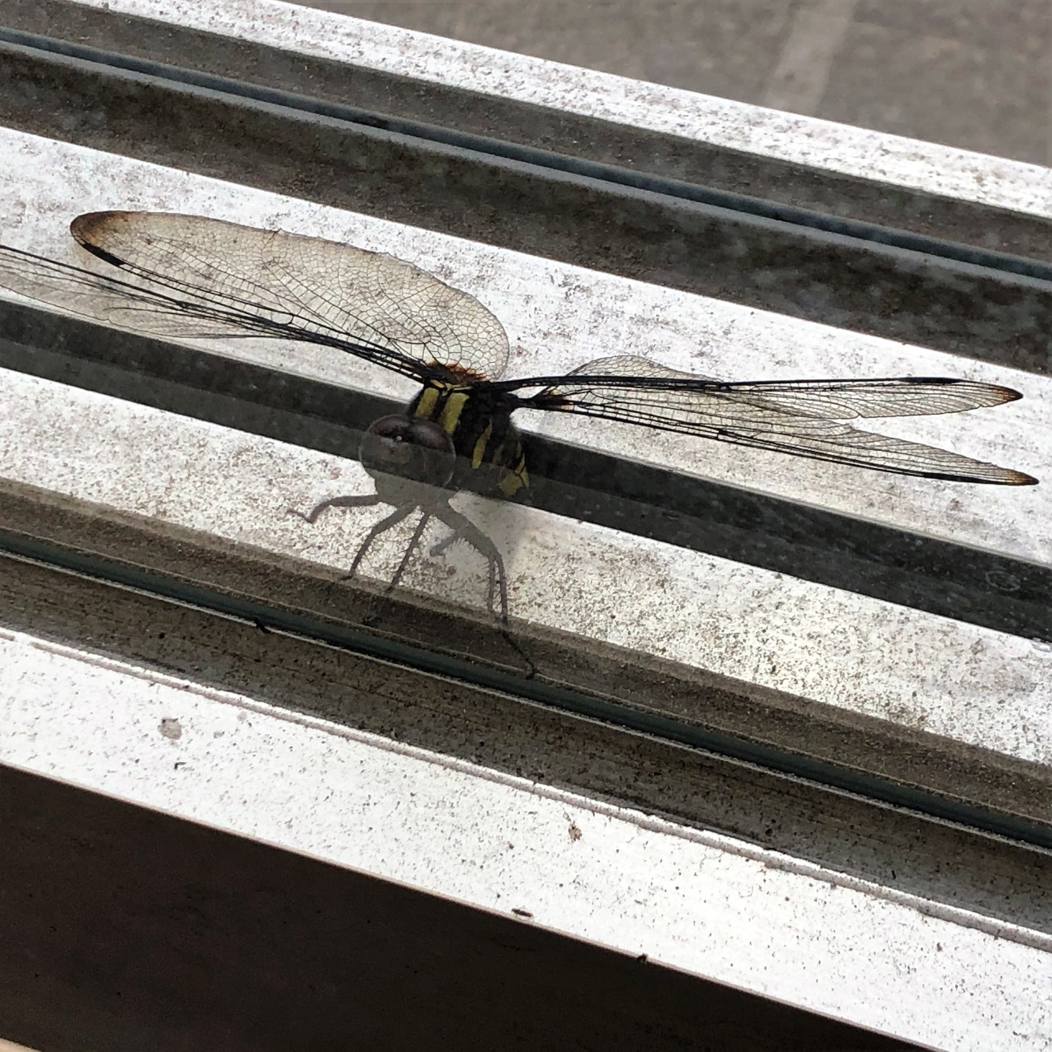 自動ドアのガラス戸の間にトンボ発見♪