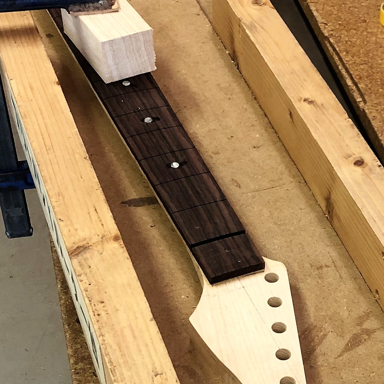 その仕込みが終わったら指板(ピアノでいう鍵盤)を上から貼りつけます。