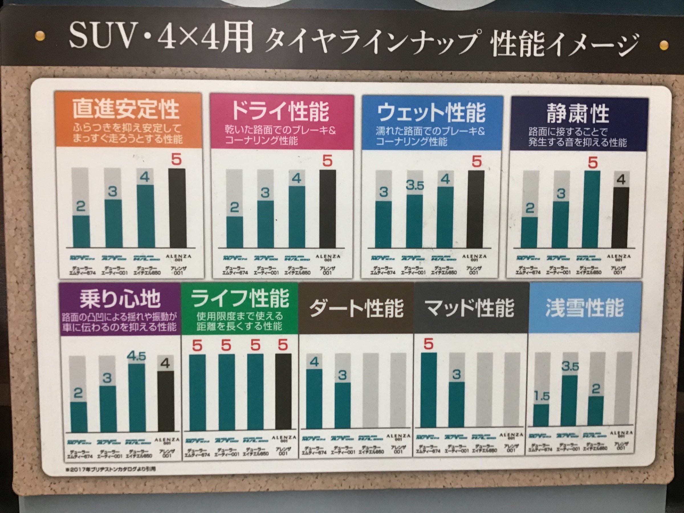 売り場にはSUV・4×4タイヤの性能比較表も置いてあります