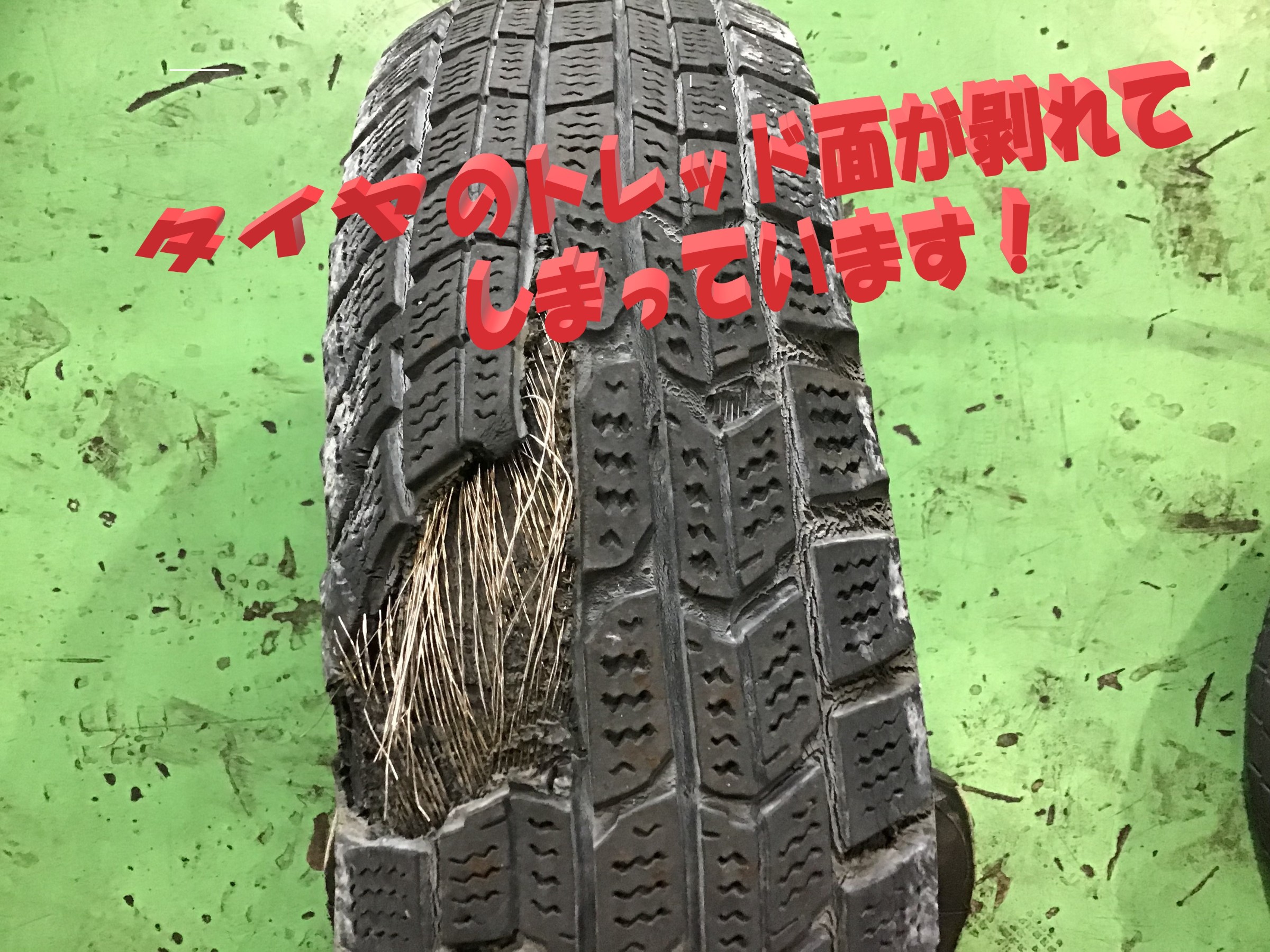 タイヤのトレッド面が剝れてしまって、中のワイヤー部分が