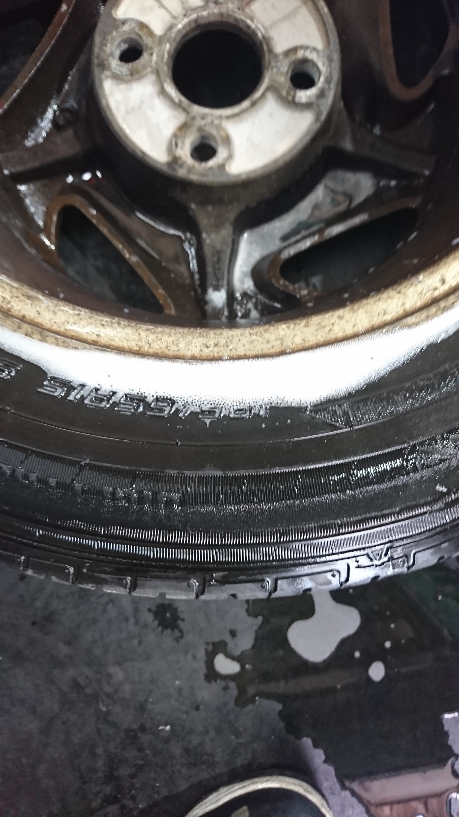 石鹸水をかけてみると!タイヤとホイールの組付部分から大量の泡が!