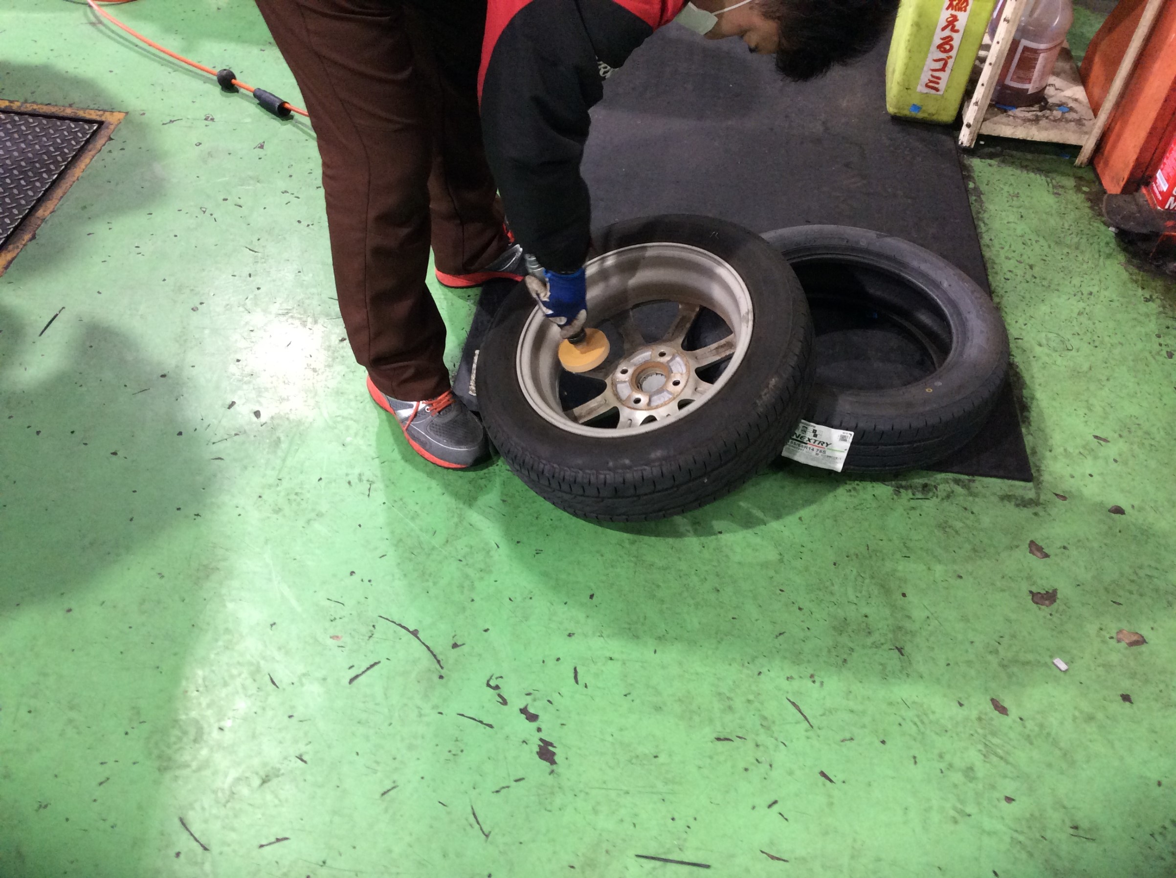 タイヤ交換時の、ホイールに残った古いバランスウエイトのシールをはがしてます。