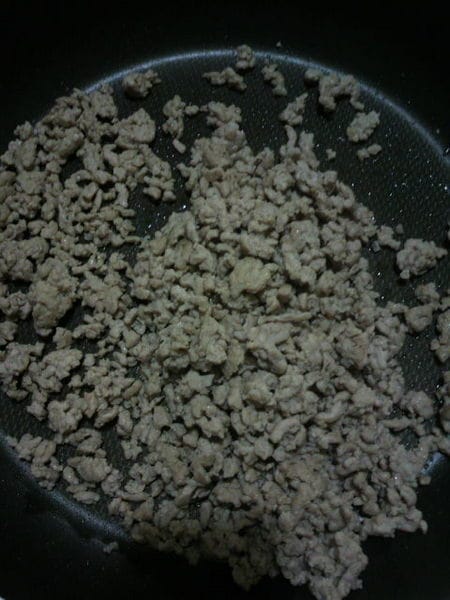 まず、フライパンに少量の油を入れ、ひき肉を“よく”炒める。