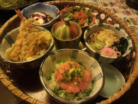 注文した料理(写真)、ですが、ミニ丼が2種類選べて、うどん、サラダ、茶碗蒸し、デザートが食べれる、豪華なものでしたぁ+。:.゚ヽ(´∀`。)ノ゚.:。+゚