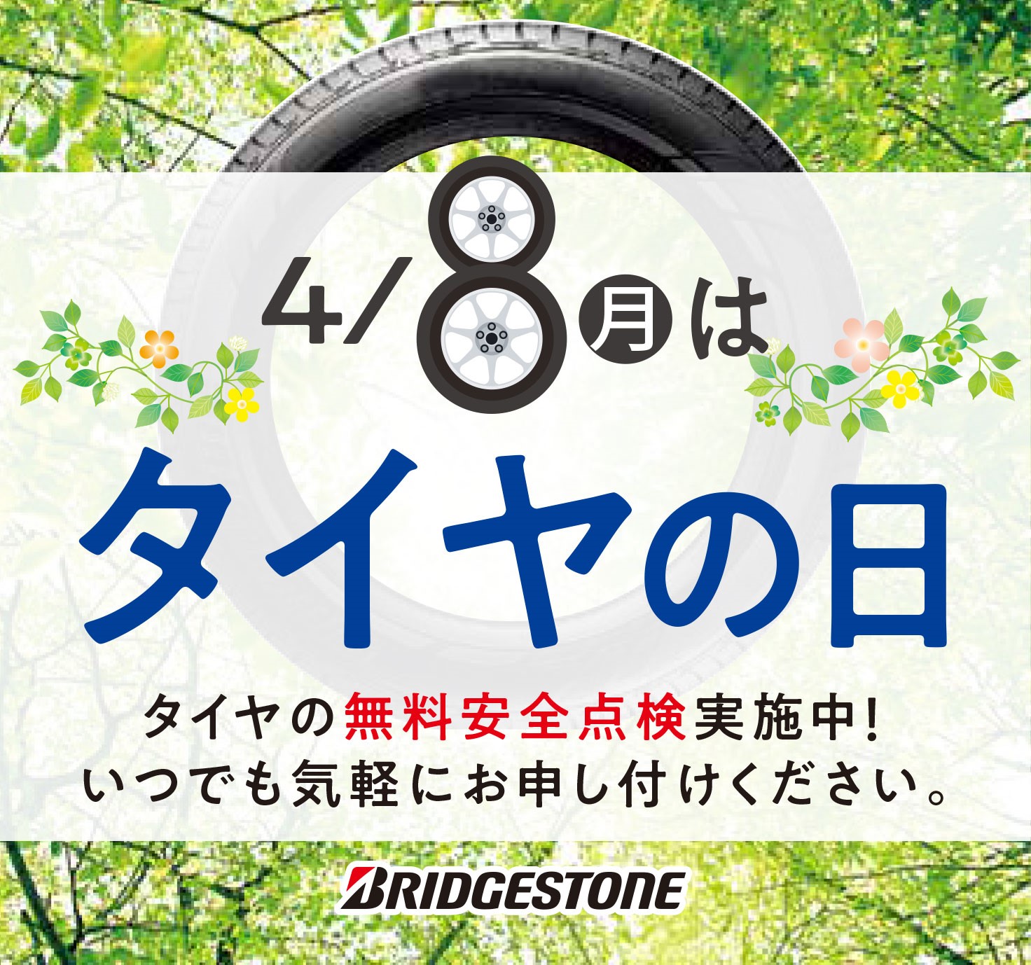 4月8日はタイヤの日 ポスト 2019年4月3日 いつもタイヤ館松戸店をご愛顧いただきまして、 誠にありがとうございます<(_ _)> ブリヂストンは、4月8日をタイヤの日とさせていただいております。 タイヤ館では、いつでもタイヤを始めとした、お車の無料安全点検を 実施させていただいておりますが、4月は特にタイヤの点検を強化させて いただきますので、お気軽にご来店下さいませ<(_ _)> カテゴリ:お知らせ