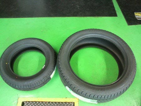 向かって左が、普通のタイヤです。