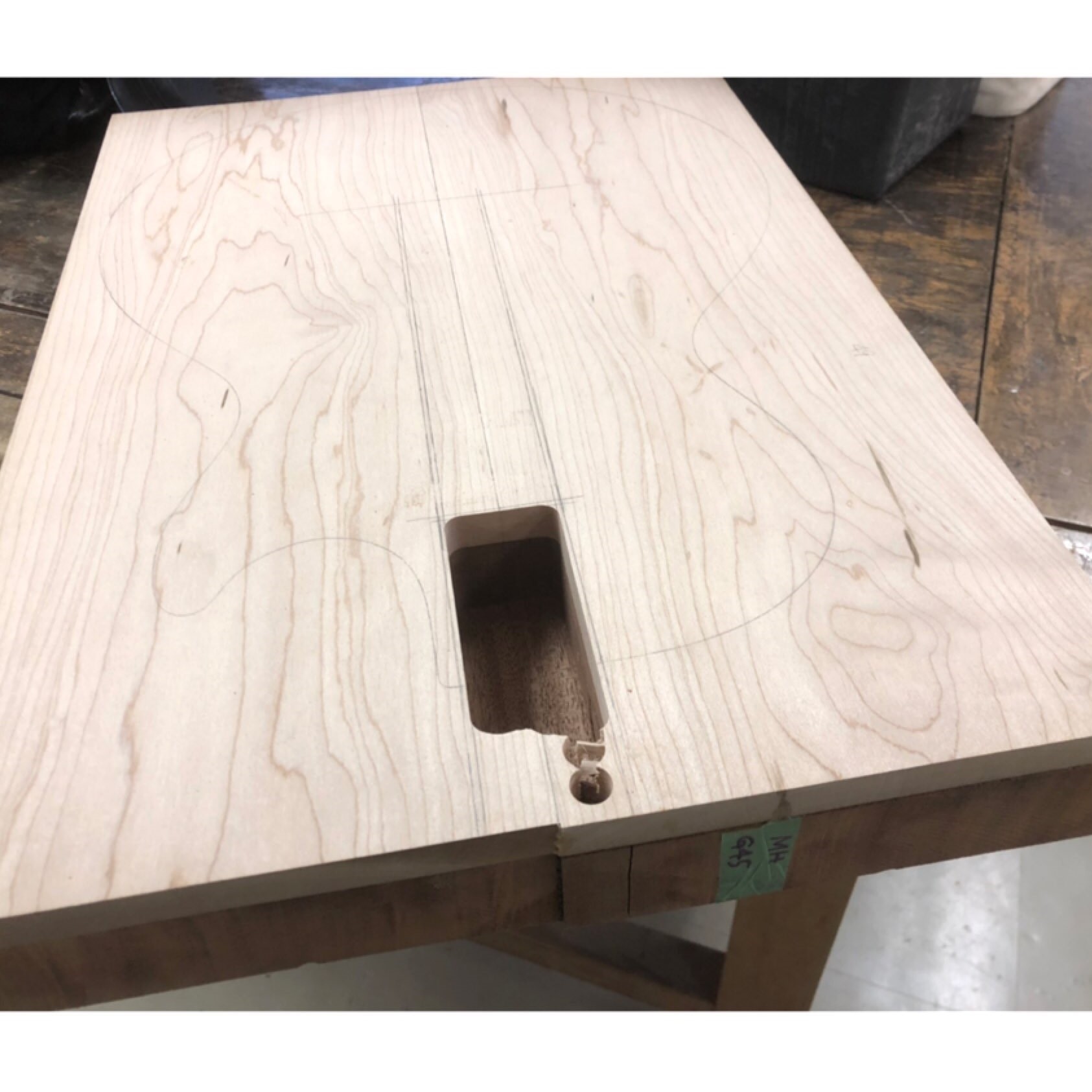 1枚板のマホガニー材とメープル材を貼り合わせ、しっかりと乾燥、密着させます。