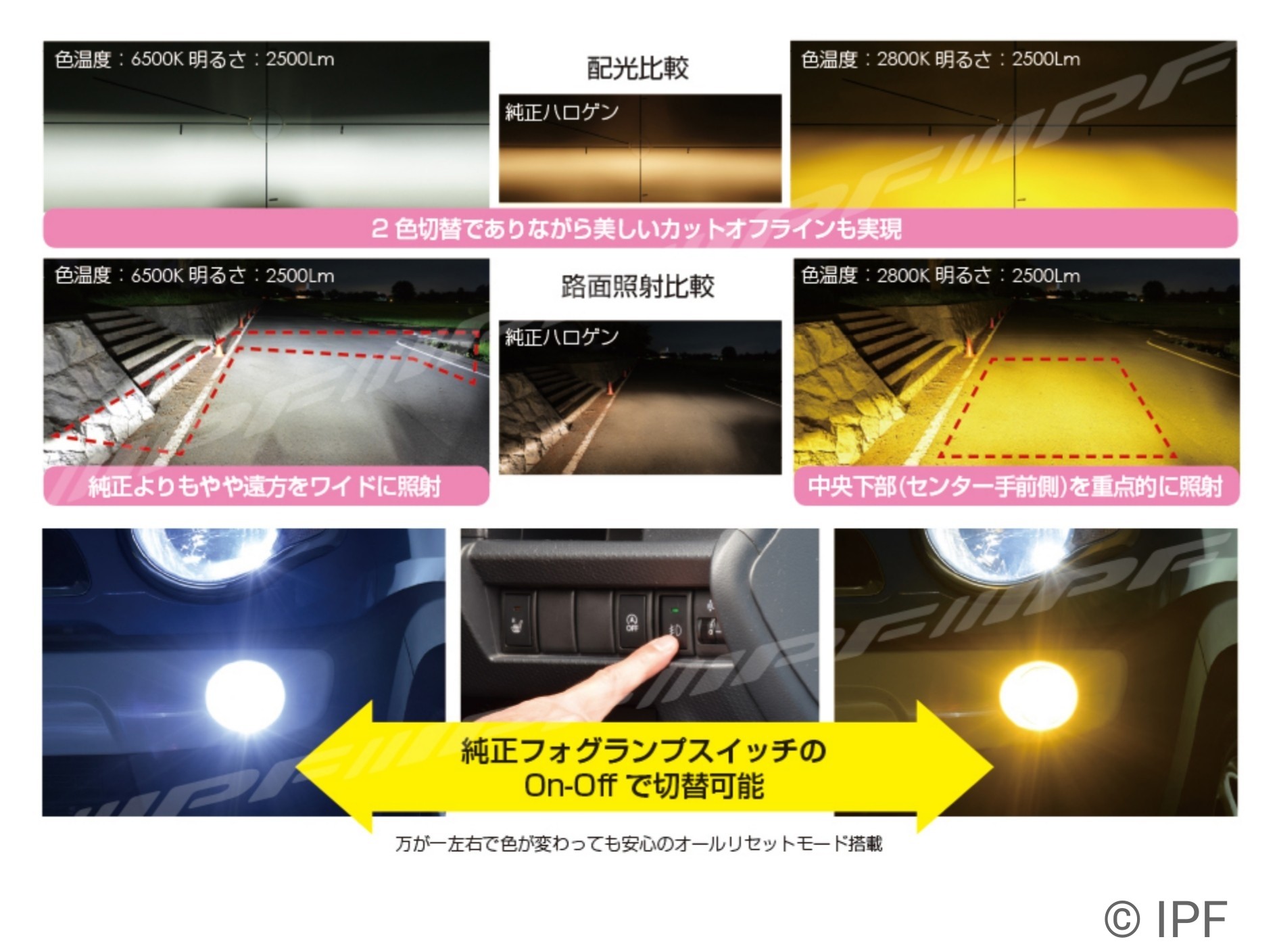 悪天候時のウェット路面では視認性の高いイエロー光(2800K)。
