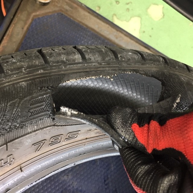 タイヤの側面を強打した場合、傷が付いたり、穴が開いてしまったりする事があるんです。