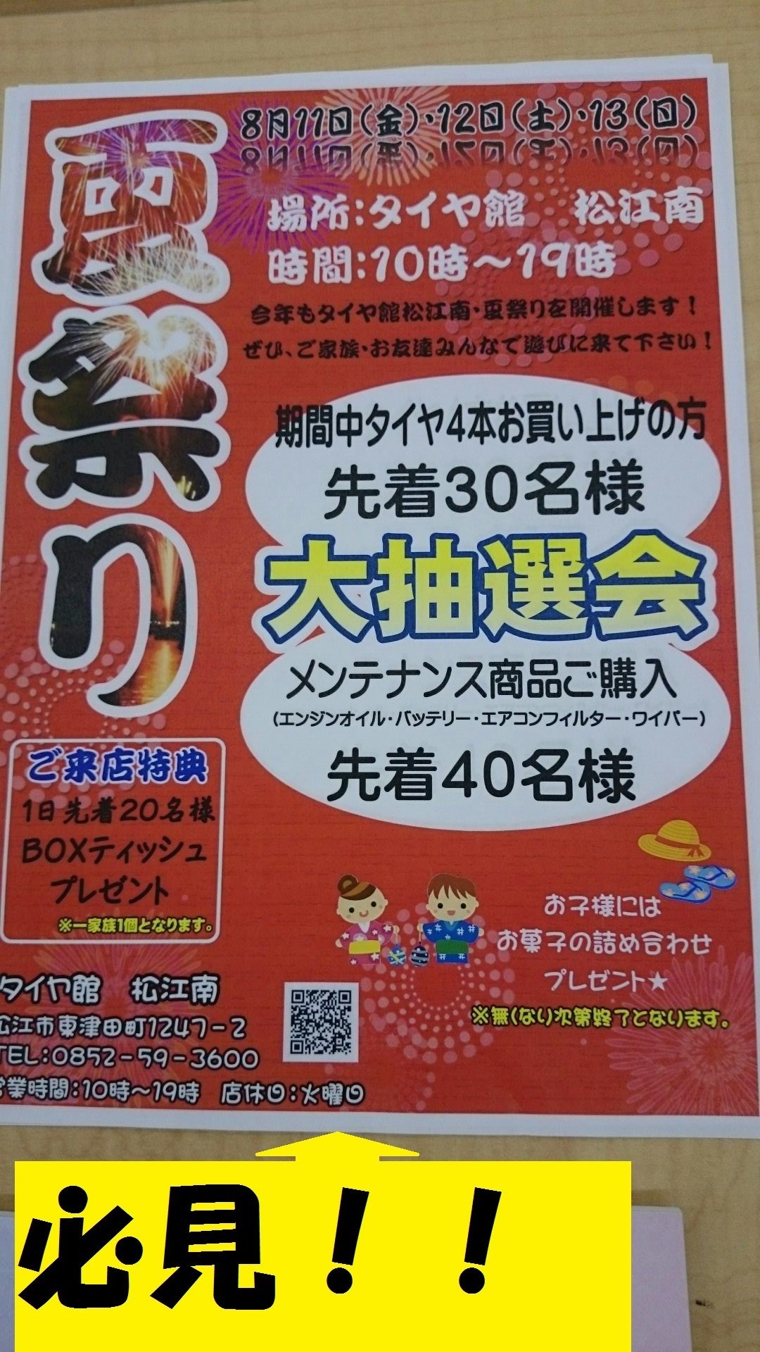 8/11日~8/13日 夏祭りイベント開催 ポスト 2017年8月4日 いつもありがとうございます! 『夏祭り』開催致します! タイヤやエンジンオイルをお買い上げいただいた方へ先着ですが抽選会をやりますよ スタッドレス値上げ前のこの時期!早期予約でお得に準備しましょう! もちろんお見積りだけでも大歓迎です! 詳しくはスタッフまでお問い合わせ頂くか、セール情報をご覧ください! カテゴリ:お知らせ