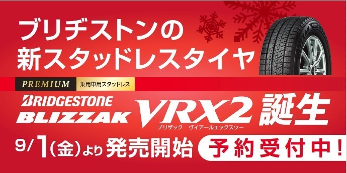 4年ぶりのブリヂストンスタッドレスの新商品! ポスト 2017年9月4日 ついに出ました! ブリヂストン スタッドレス ブリザック VRX2 予約開始です! 詳しくはスタッフまでお問い合わせください カテゴリ:お知らせ
