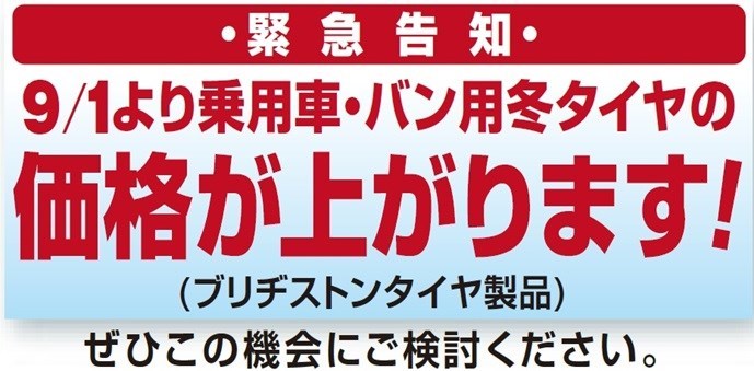 乗用車・バン用タイヤ冬用タイヤ(ブリヂストンタイヤ製品)が値上がりします!!
