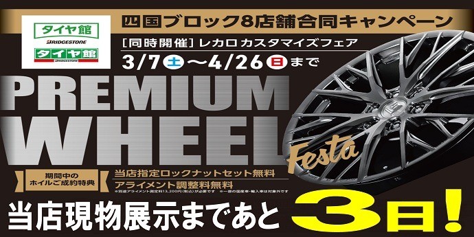 プレミアムホイルフェスタの展示ホイール♪ タイヤ館松山にやってきました! 遂にプレミアムホイールフェスタの展示ホイールが タイヤ館松山にやってきました!! めちゃくちゃインパクトあります!! この機会に是非ご来店下さい!!