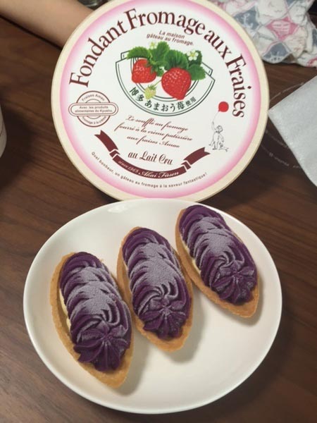 おやつタイムは赤い風船のいちごフォンダンフロマージュと沖縄土産の生むらさき芋タルト(*^_^*)