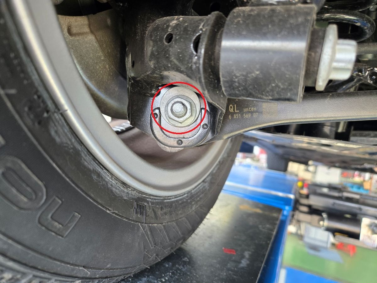 E型トルクスという少し特殊なボルトを3カ所ゆるめてリアのトゥを調整します。