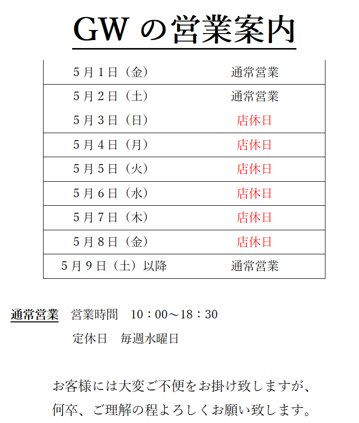 平日 10:00~18:30 日曜祝日 10:00~18:30