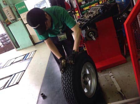 その横で、店長が何やら怪しいタイヤを組んでます。