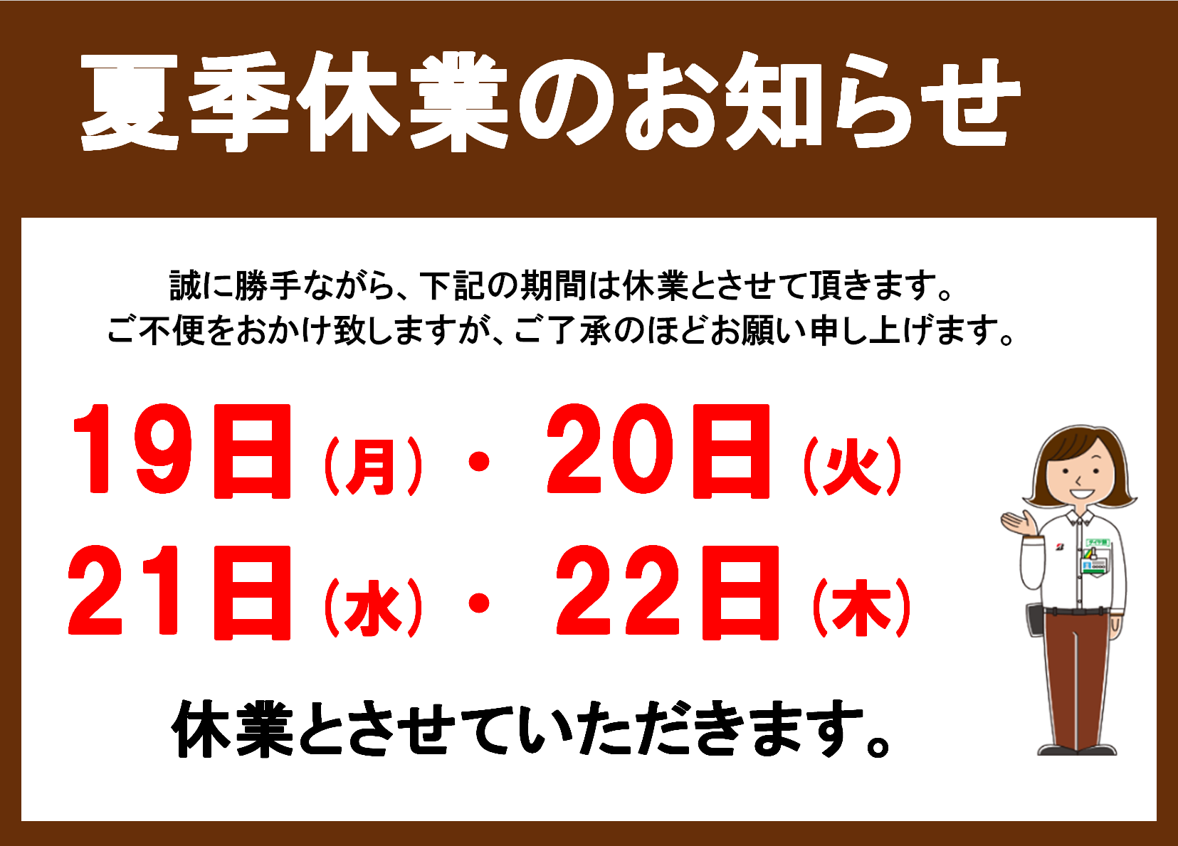 夏季休業のお知らせ 8/19(月)~8/22(木)