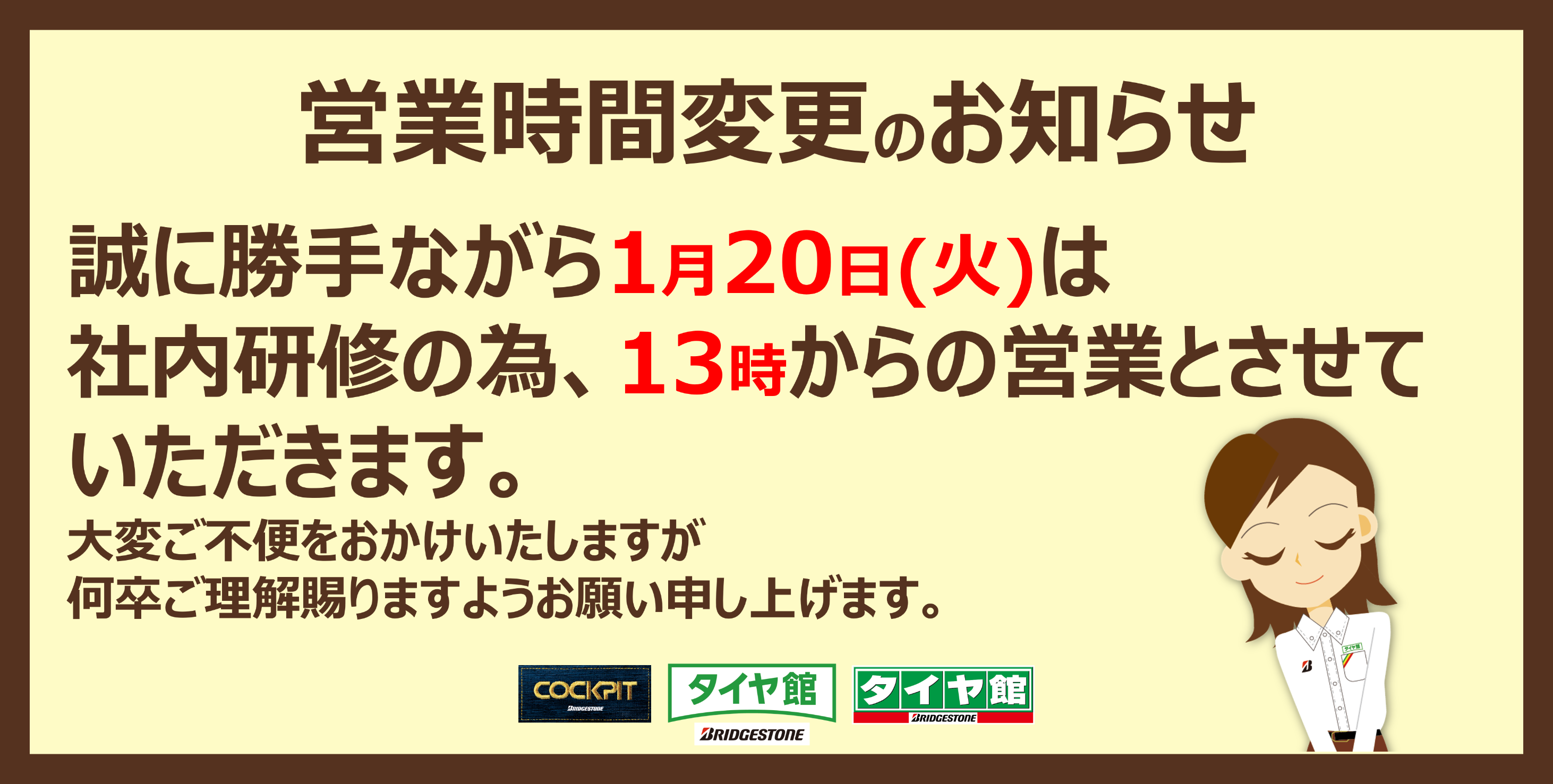 1月20日の営業時間の変更についてのご案内です。