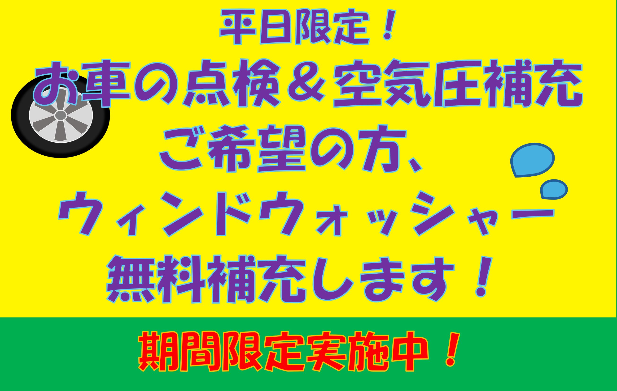 期間限定!平日限定!タイヤの空気圧補充とウィンドウォッシャーも!