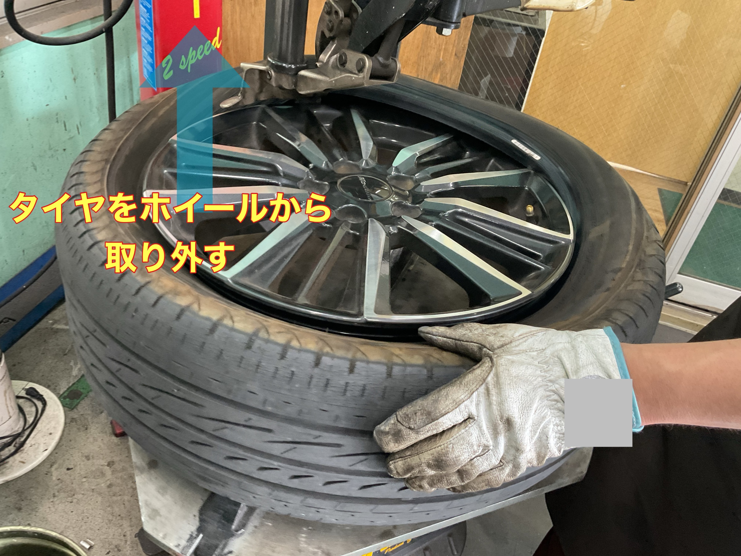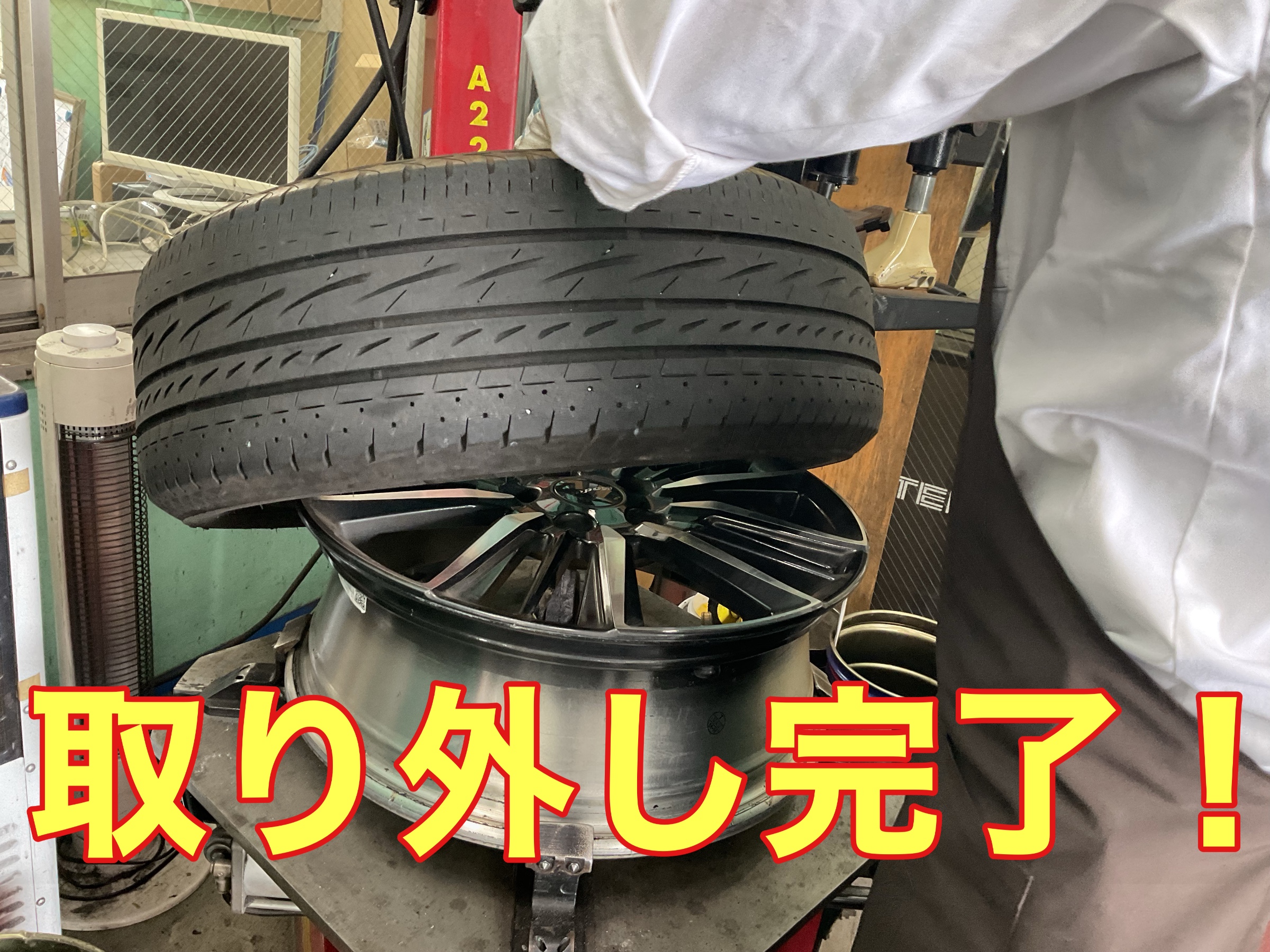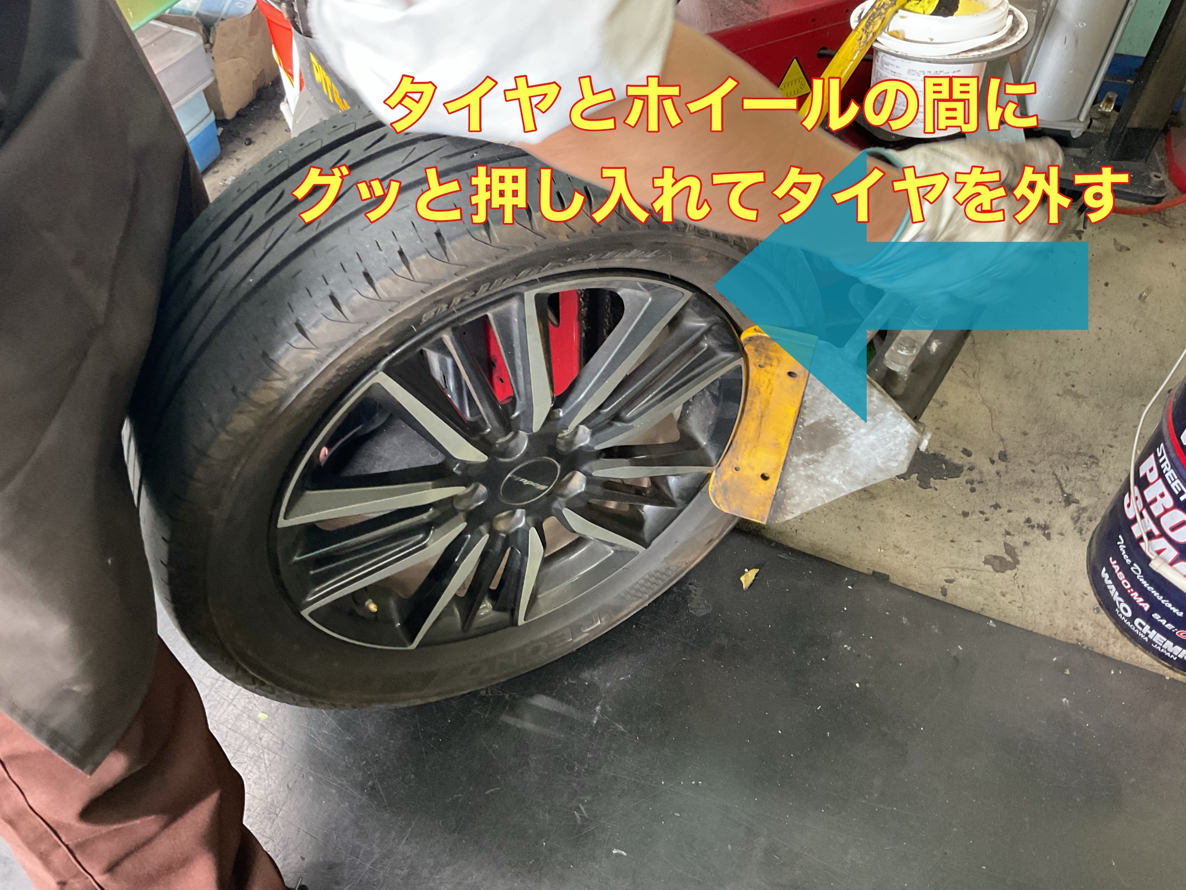 タイヤの中の空気を抜いた後、ホイールにくっついているタイヤを剥がします!