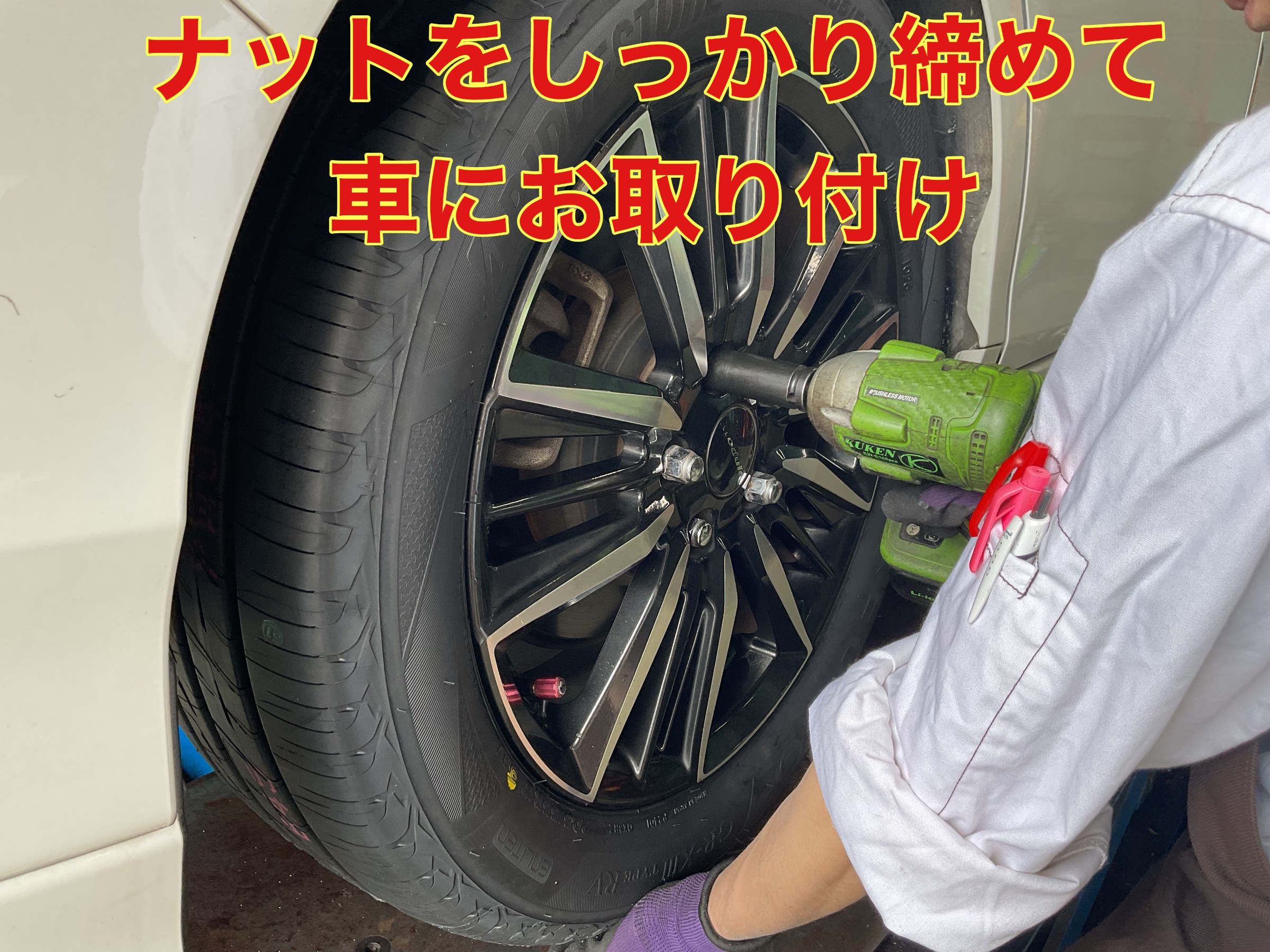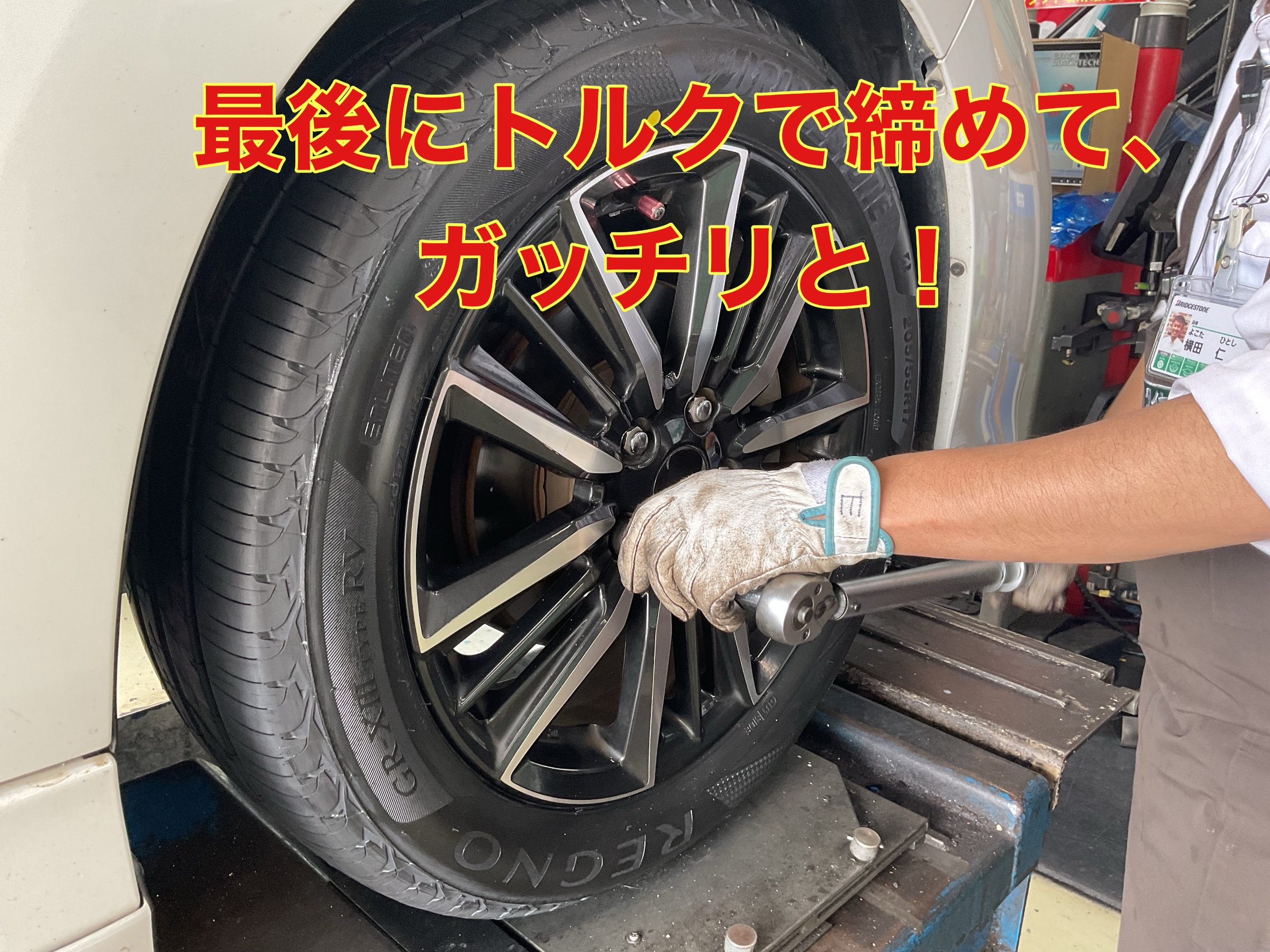 ホイールをナットで固定して、外れないようにトルクで強く締め付けて、
