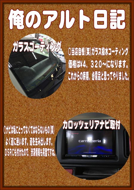今回の俺のアルト日記は、ガラス撥水とナビの取付けになります。