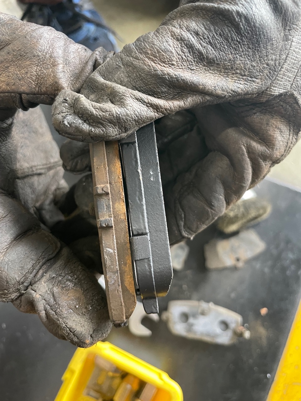 左が使用済みブレーキパッド、右が新品のブレーキパッドです!