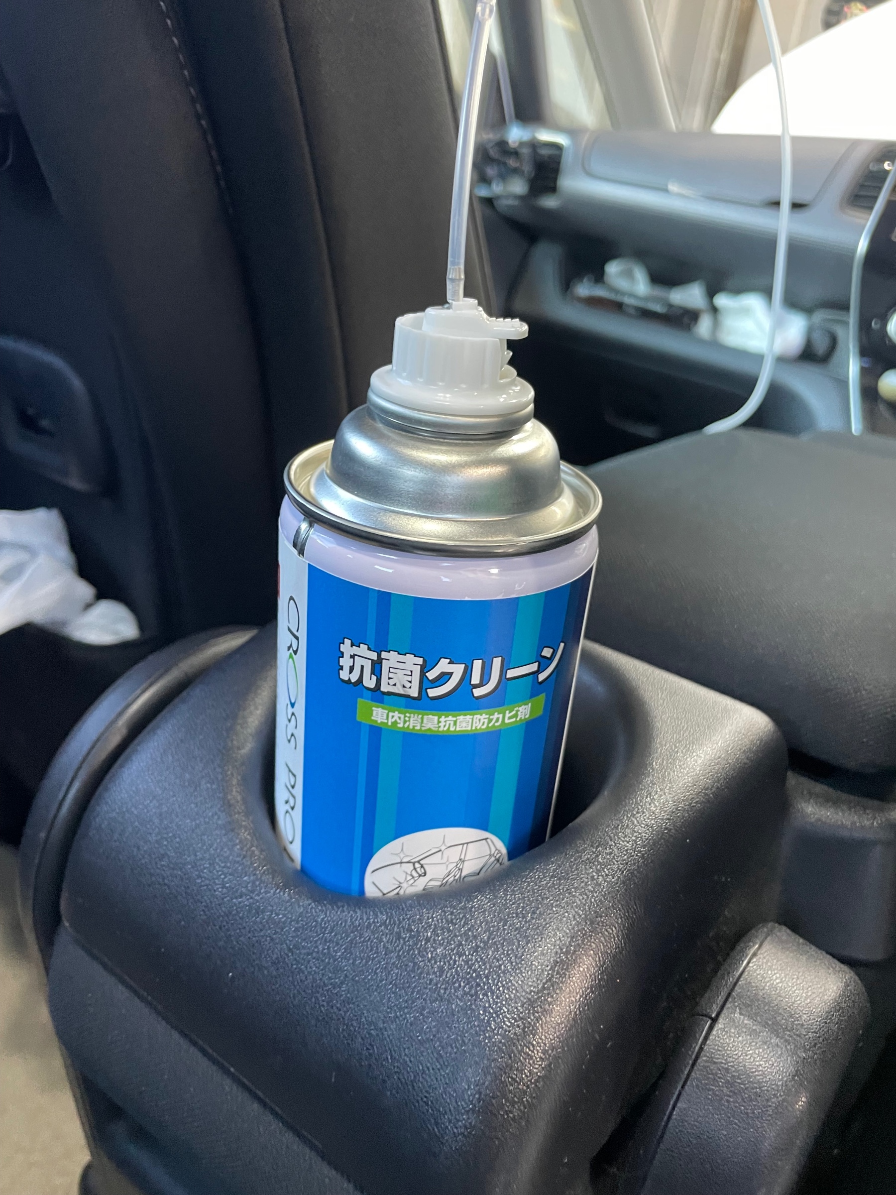 エバポレーターの所に差し込み、ミスト噴射で車内の消臭・抗菌・防カビコーティングを行います。